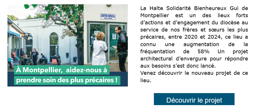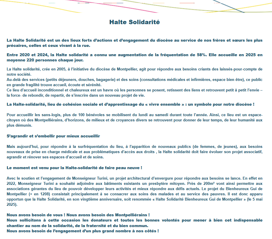 Le lundi 5 mai 2025, Monseigneur TURINI, archevêque de Montpellier, baptisera ce lieu « Halte solidarité Gui de Montpellier » en l’honneur de Gui de Montpellier, reconnu Bienheureux le 18 mai 2024 par le pape François pour son action auprès des pauvres de Montpellier et de toute l’Europe au 12ième siècle.