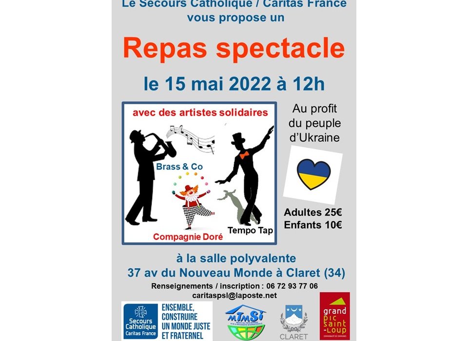 L'équipe du Secours Catholique de Saint-Mathieu de Tréviers vous propose un repas spectacle à Claret, le dimanche 15 mai 2022 à 12 heures,