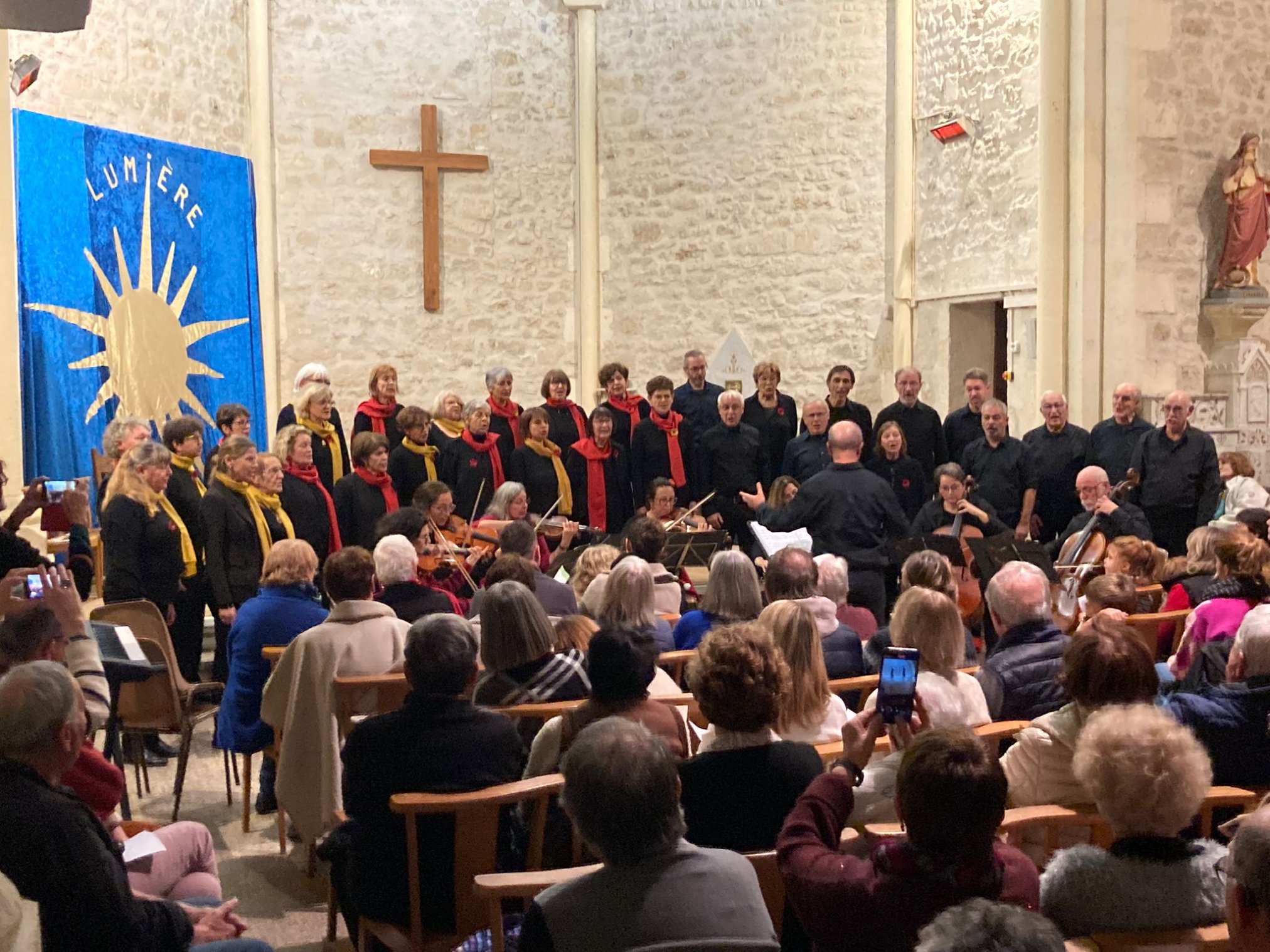 Sous la direction du chef de chœur, le public a été invité à participer et s’est prêté avec enthousiasme au jeu, reprenant notamment le célèbre « Gloria » du chant Les anges dans nos campagnes.