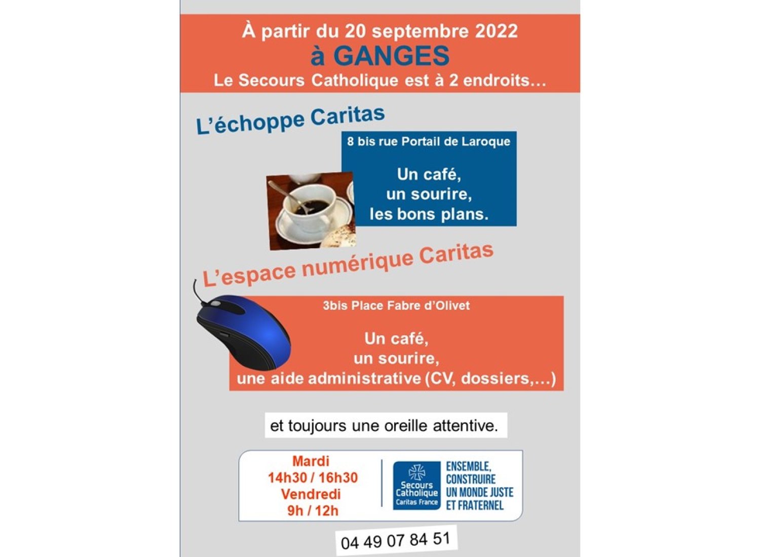 À partir du 20 septembre 2022, à Ganges, le Secours Catholique sera présent dans deux endroits ! L’Echope Caritas : Un café, un sourire, des bons plans, L’Espace Numérique Caritas : Un café, un sourire, une aide administrative (CV, dossiers, …), Et...