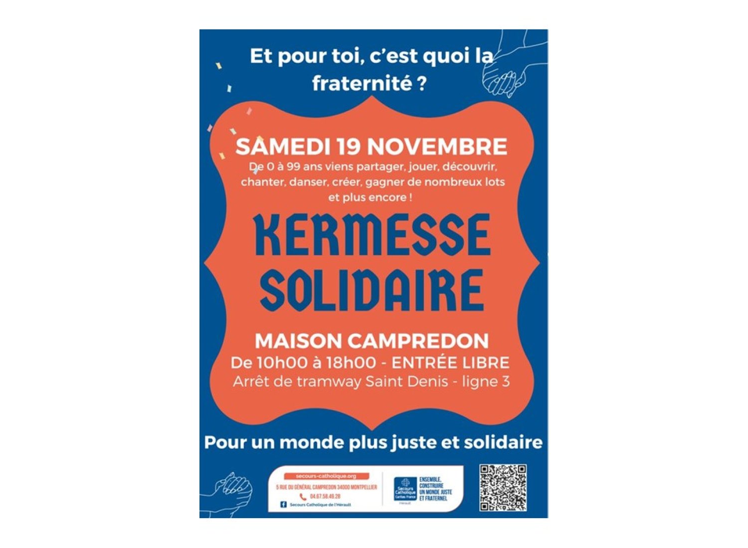 Et pour toi, c’est quoi la fraternité ? De 0 à 99 ans vient partager, jouer, découvrir, te divertir, chanter, danser, créer, gagner de nombreux lots … et plus encore ! Pour un monde plus juste et solidaire.